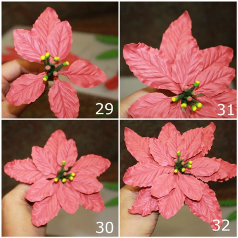 Procederemos de igual forma con los 5 pétalos medianos, y por último con los 5 grandes. Colocaremos también las tres hojas verdes.