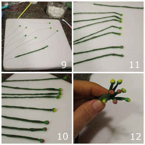 Ponemos un poco de pegamento en la parte doblada del alambre e introducimos las bolitas, dejamos secar.