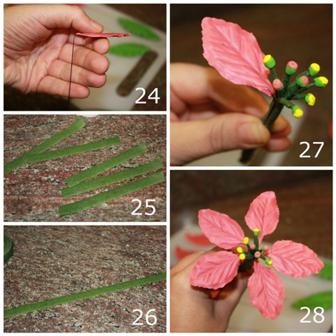 Pasta de flores teñida de color rojo, verde y amarillo (en mi caso al rojo y al verde les puse un poco de negro al teñirlo, para que quedara más oscuro).