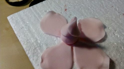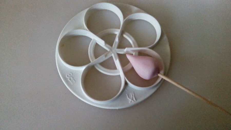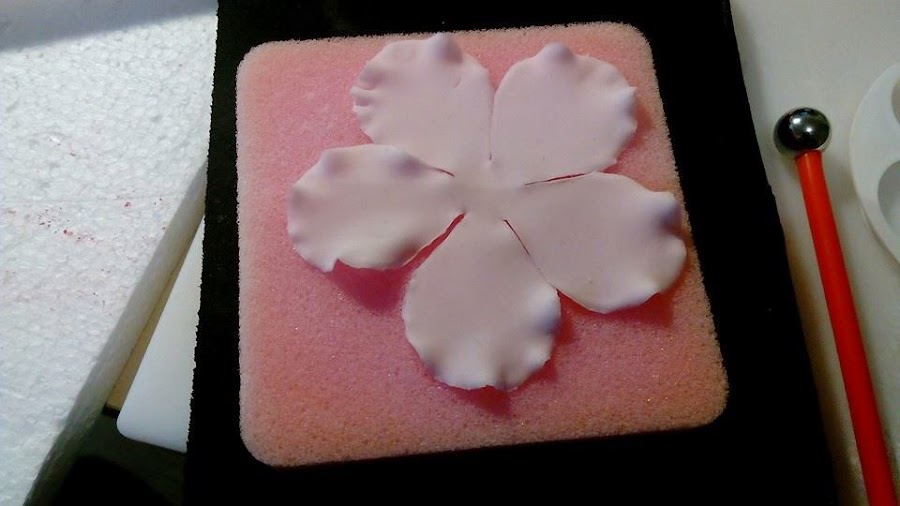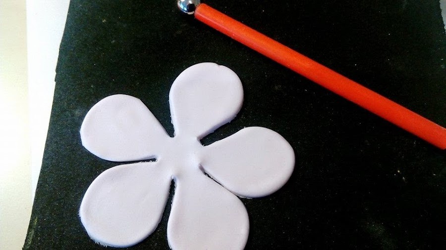 Con una esteca de bolillos, presiona el centro de cada pétalo para lograr este efecto. Para que no se pegue la esteca al fondant, puedes ponerle un poquito de maicena.