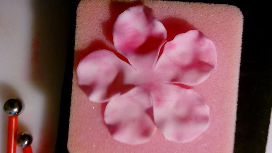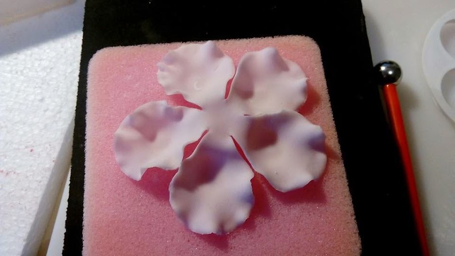 Con la esteca de bolillos, afina bordes y traspásala a la alfombra, dándola vueltas, es decir, dejándola al revés. Ahueca cada pétalo tal como lo explico más arriba. Pon el pegamento comestible.