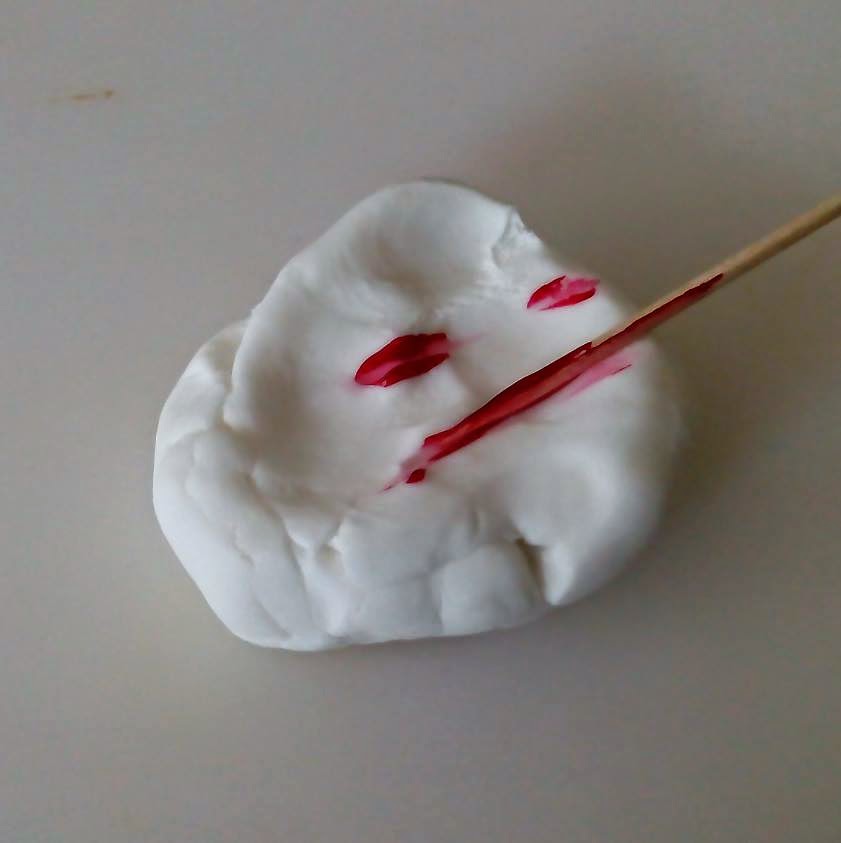 Toma un trocito de fondant y con la ayuda de un palillo, agregas una gotita.