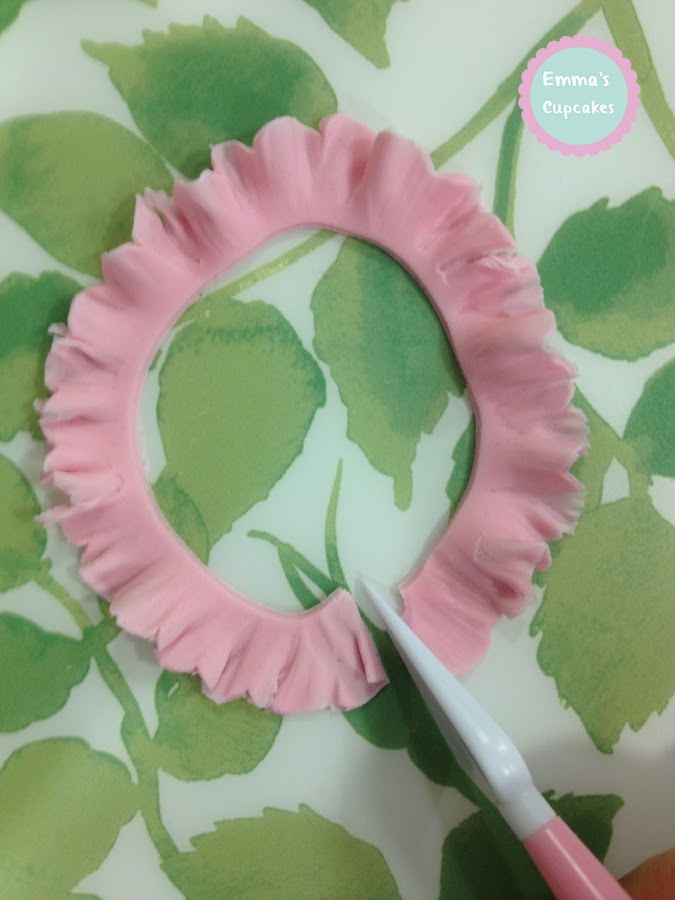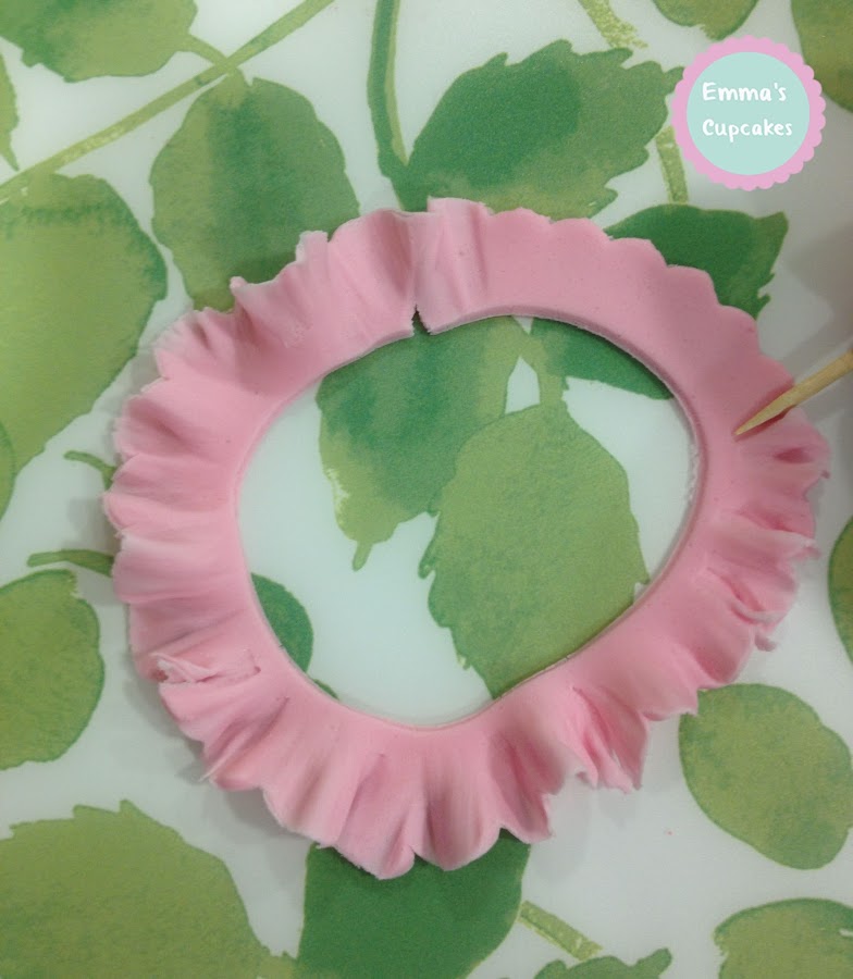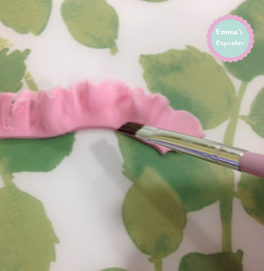 Con un pincel humedecido en agua aplicamos sobre la parte no rizada del fondant.