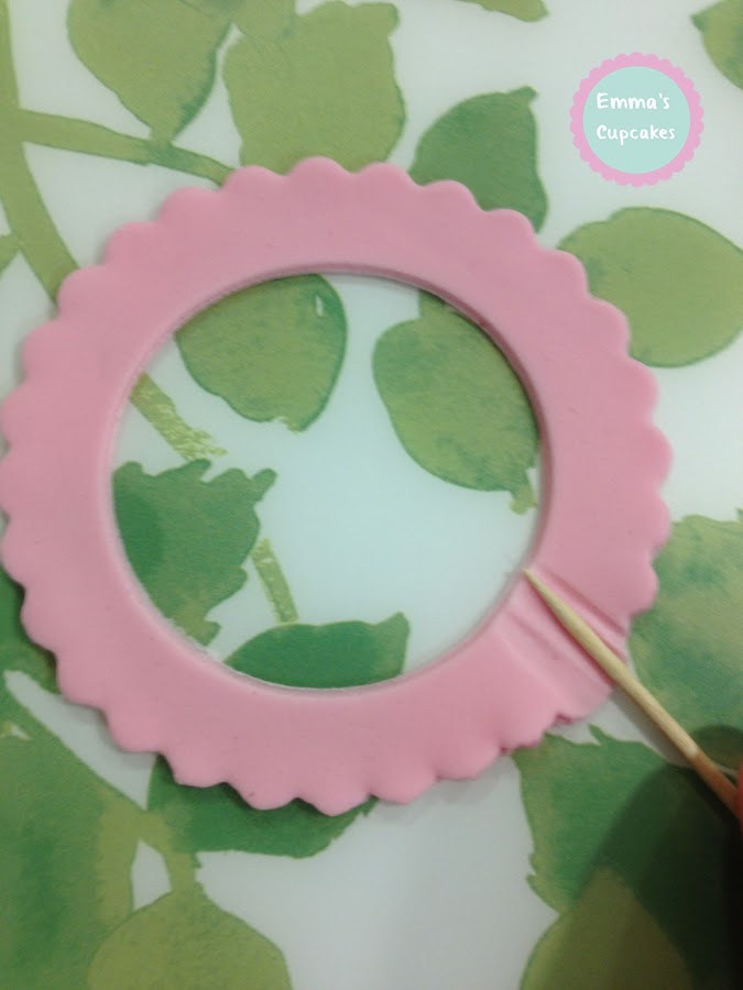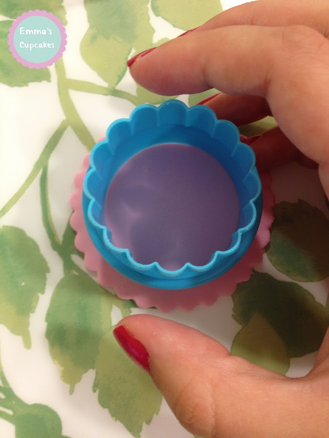 Con el molde con bordes redondeados que sea bastante grande (dependiendo de cómo queráis de grande la rosa, pero cuando más grande el círculo más "pétalos" tendrá la rosa). Una vez tenemos la redonda con un molde más pequeño, y esta vez por el círculo redondo, hacemos un agujero en el fondant.