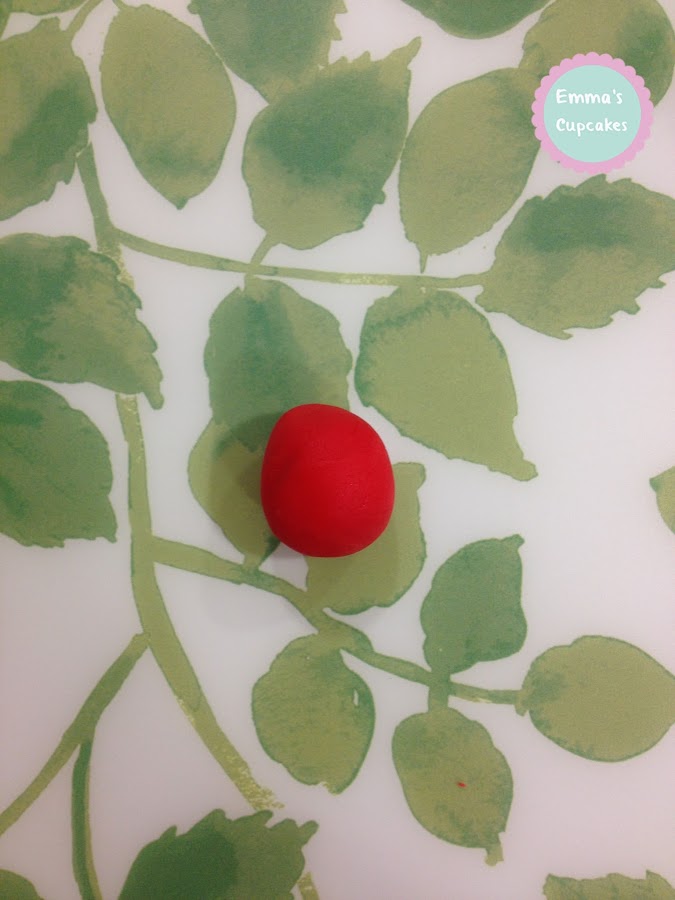 Vamos a empezar con el primer tipo de rosa, es muy sencilla. Necesitaremos una bolita de fondant rojo (aunque se puede hacer del color que se quiera). La alisamos con el rodillo de manera que quede alargada.