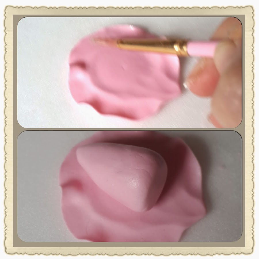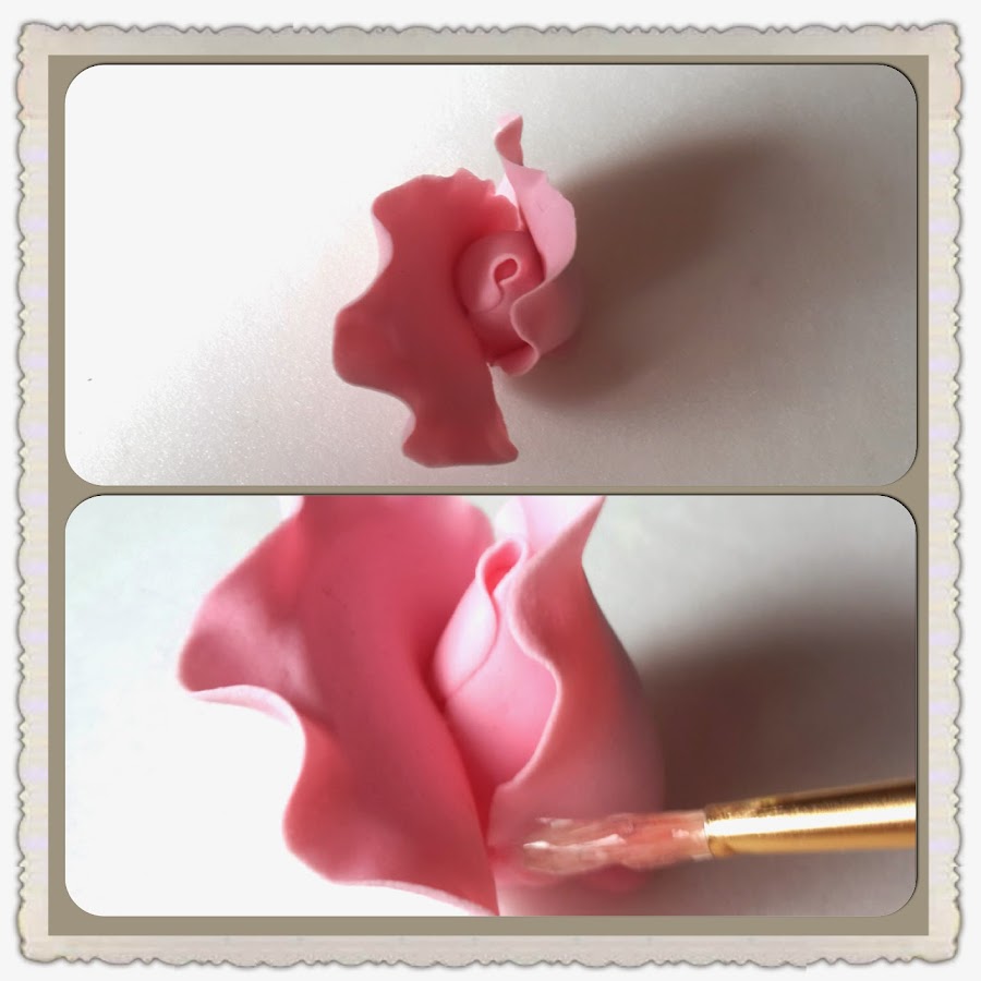 Esta vez pondremos el pegamento comestible o agua en la parte media y baja del pétalo.