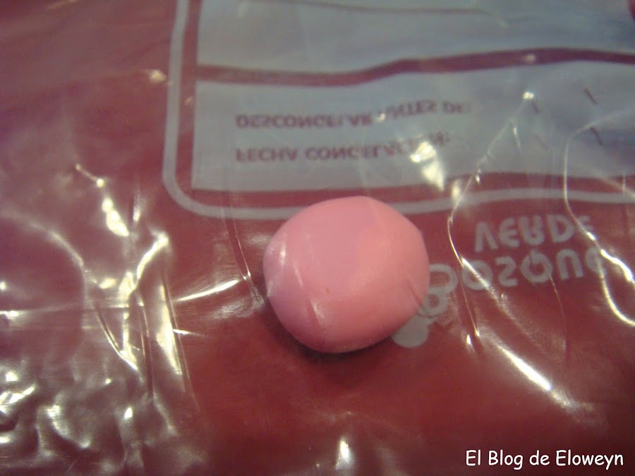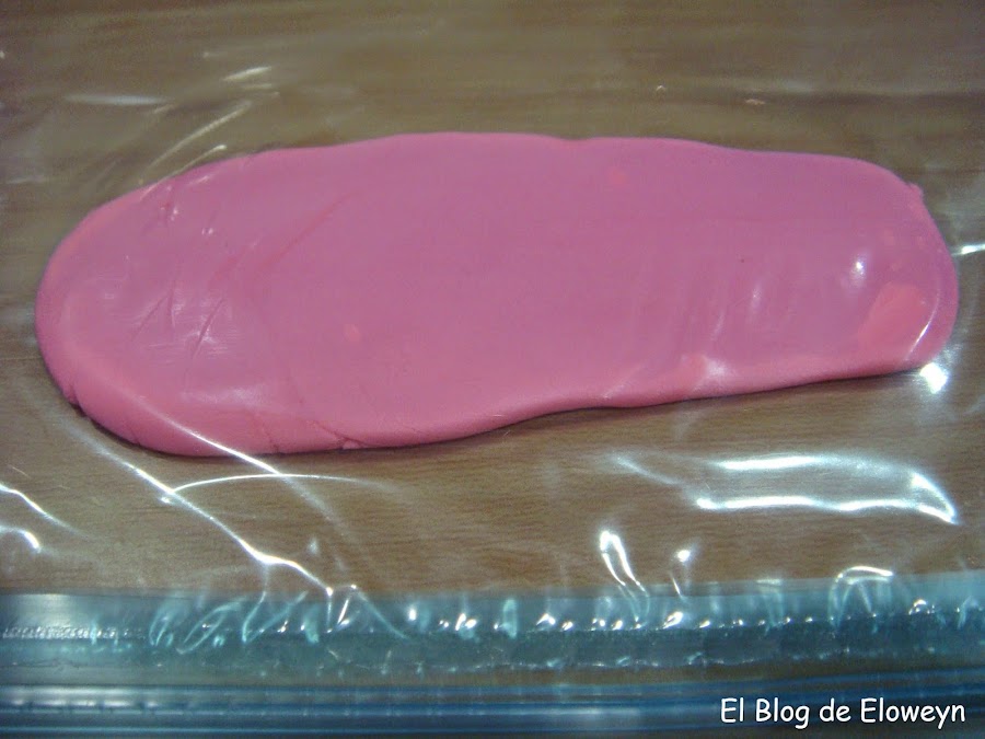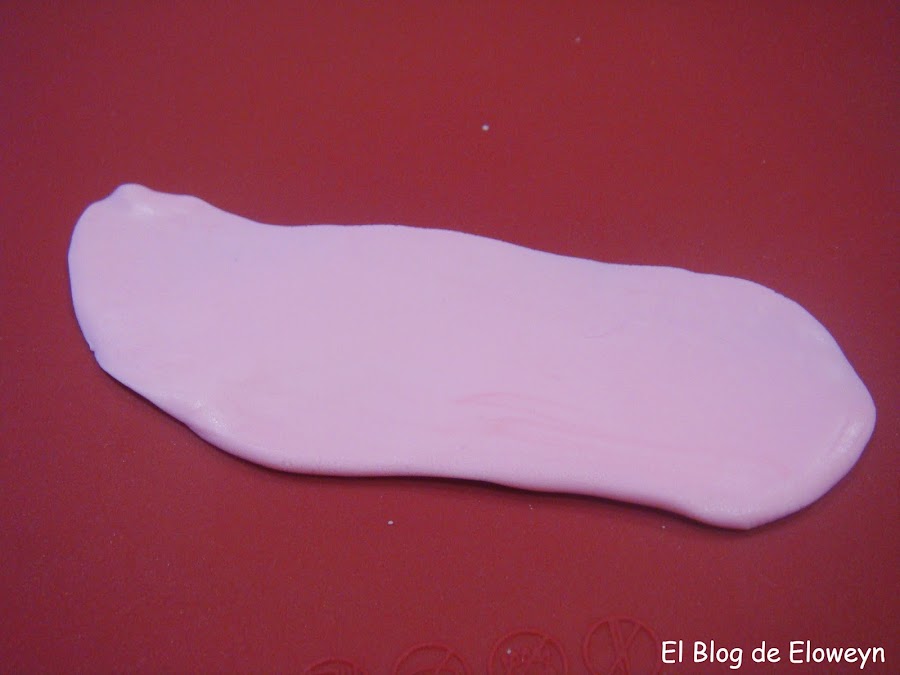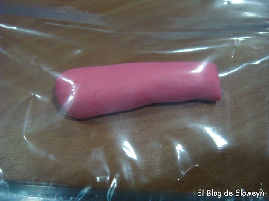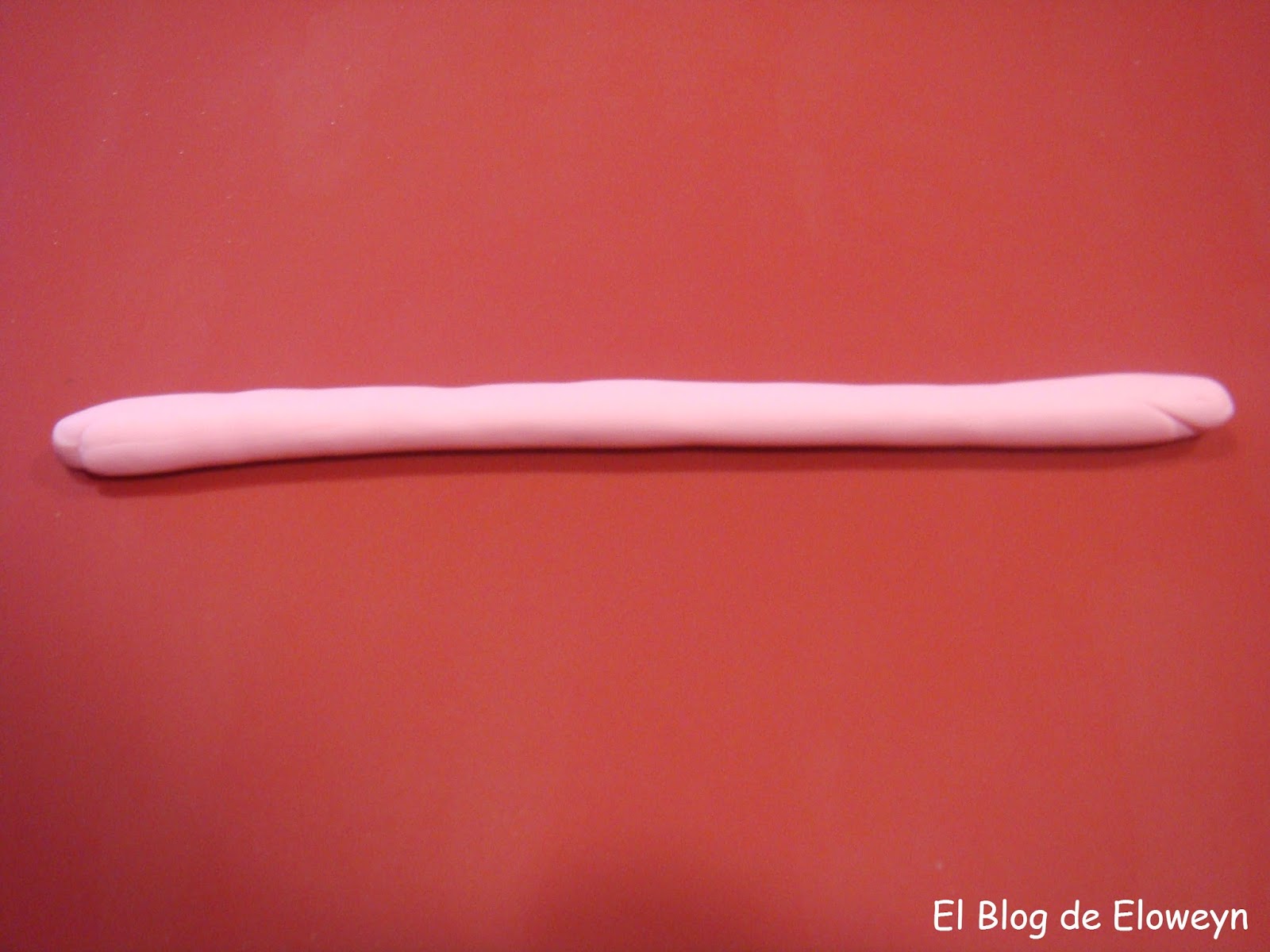 Comenzaremos con el fondant de color rosa. Hacemos un cilindro largo y estrecho. No hace falta hacerlo perfecto, ya que luego lo vamos a modelar.