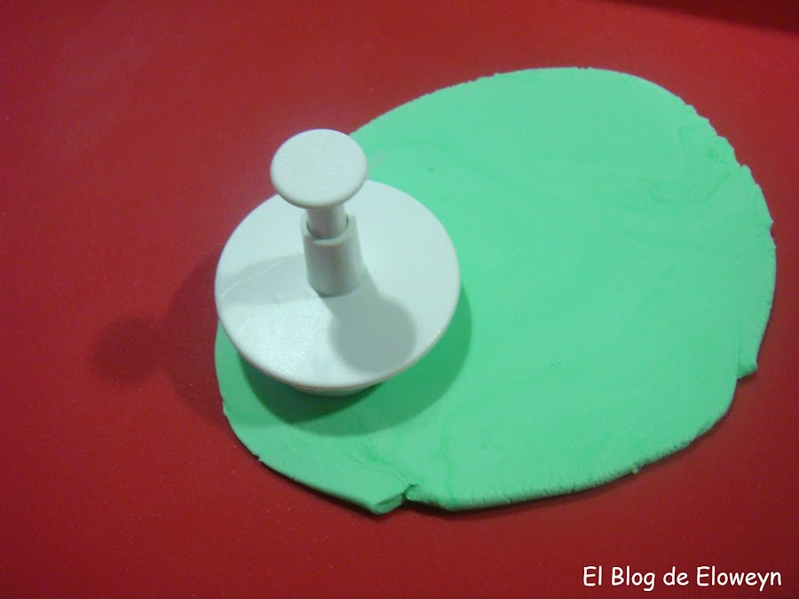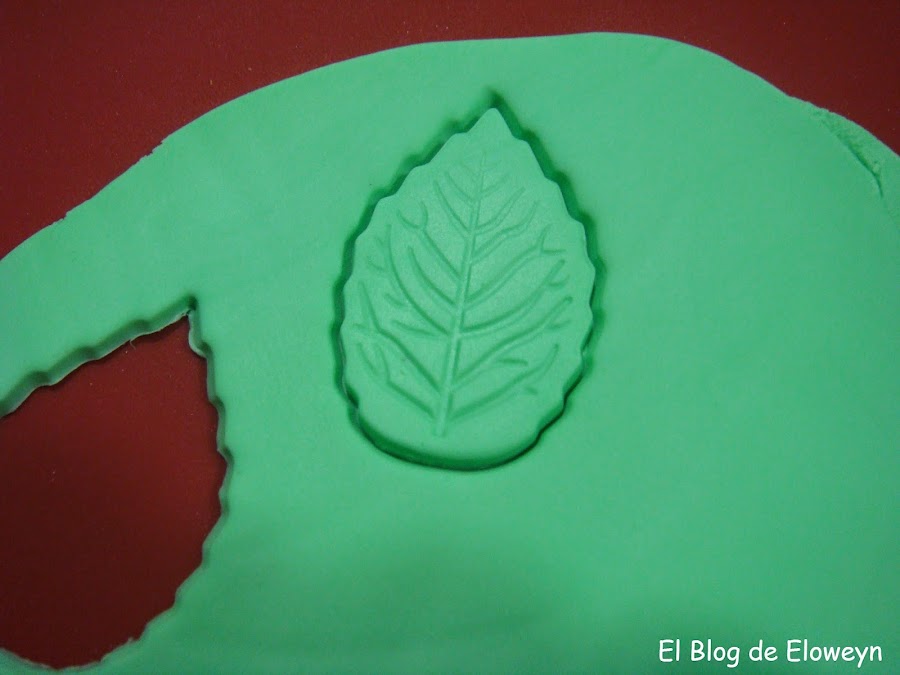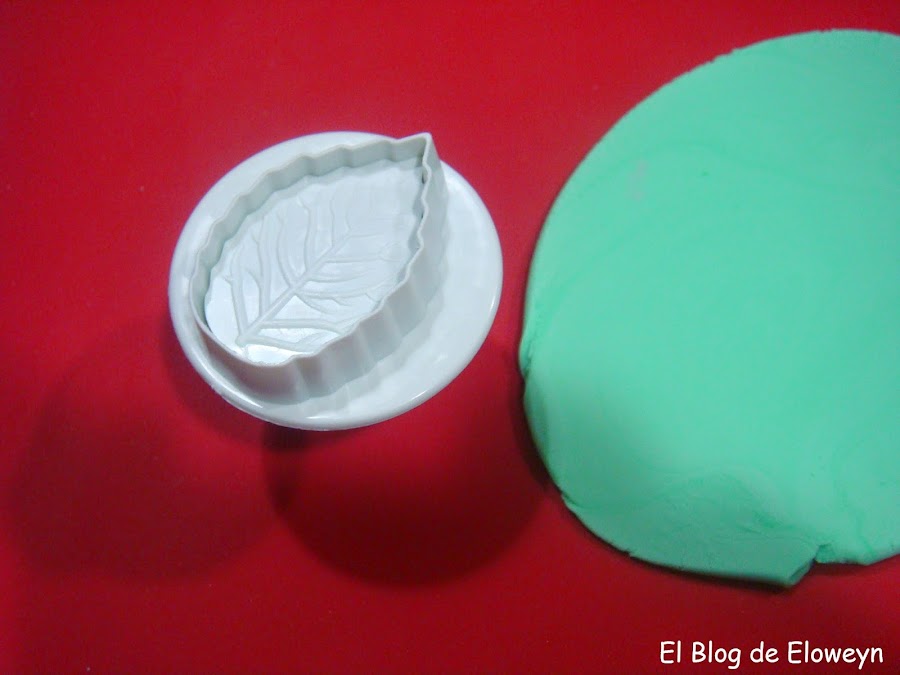 Poner el cortador sobre el fondant y presionar hacia abajo (sin pulsar el botoncito) para cortarlo. Una vez hayáis presionado, pulsad hacia abajo también el botoncito para que se dibujen los nervios.
