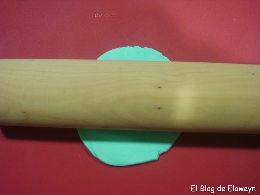 A continuación haremos las hojas. Para hacer las hojas, haremos una bola con el fondant de color verde y lo aplanaremos con un rodillo.