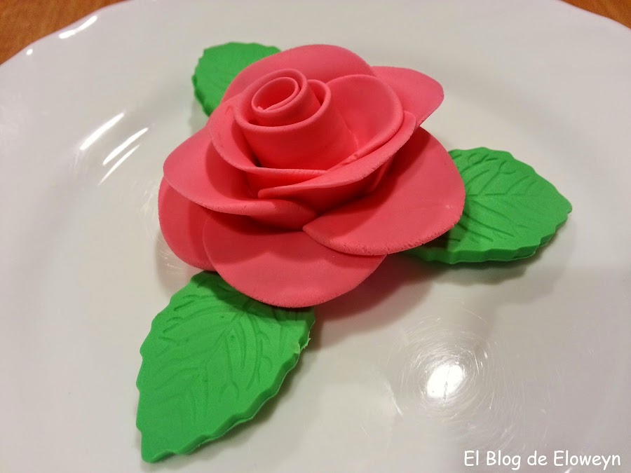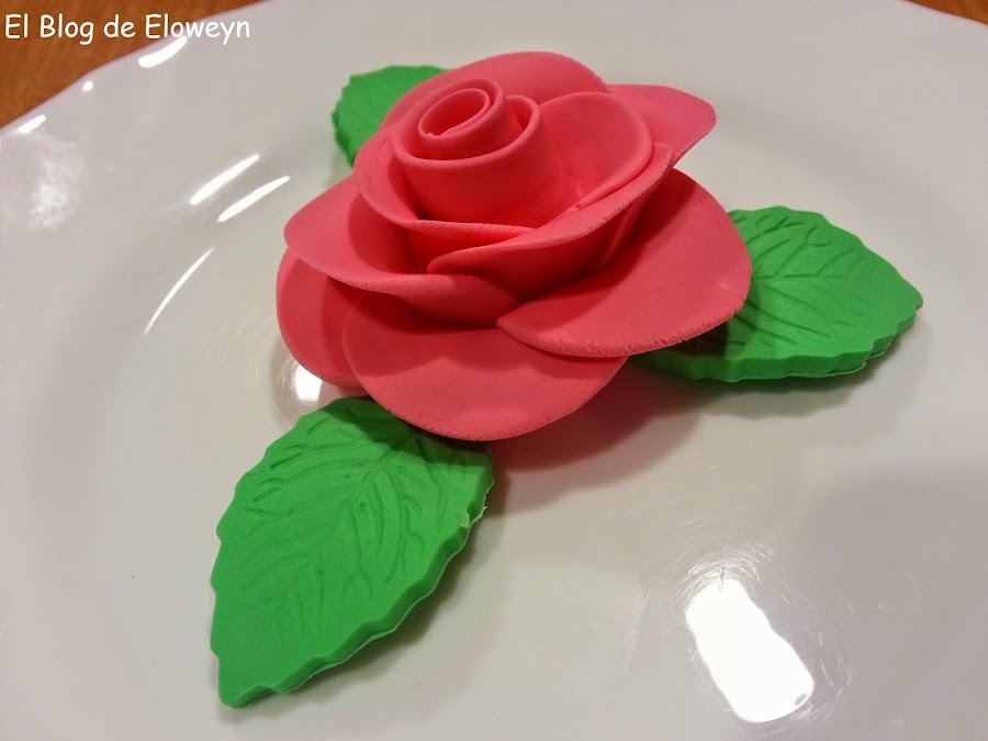 Dejaremos un par de horas las hojas en el rodillo para que se endurezcan un poquito. Para pegarlas sobre un postre yo suelo usar un poco de chocolate derretido. También dicen que con agua se pegan, pero yo no lo he probado. Y aquí tenéis la rosa montada (sobre un plato... jajaja)