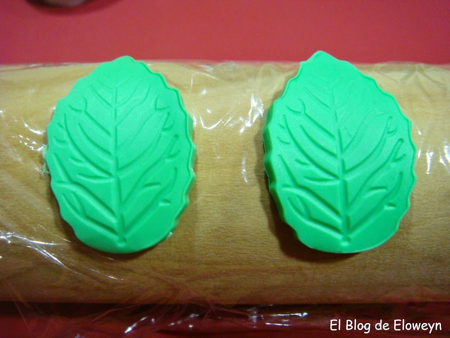 Podéis hacer tantas hojas como deseéis. Yo suelo poner tres hojas por rosa. A continuación tenemos que hacer que la hoja quede un poquito doblada. Para hacer ese efecto, yo uso el rodillo. Lo tenemos que forrar con papel film. De esta forma no se os pegará el fondant. Una vez forrado, retirar con cuidado las hojas y ponerlas sobre el papel film.