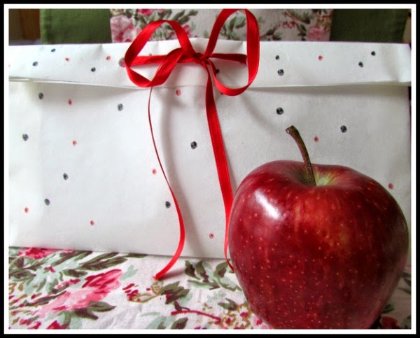 Yo he doblado la parte de arriba, he taladrado dos agujeros y puesto un lazo rojo además de los lunares de lunares de colores.