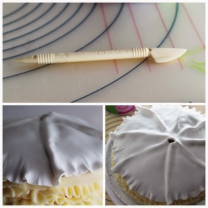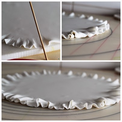 Solo tenemos que poner el fondant sobre una esponja y con un palillo tal como esta en la fotografía iremos marcando los bordes, con movimientos hacia adelante y hacia atrás, para afinar las puntas y que aparezca este precioso vuelo.