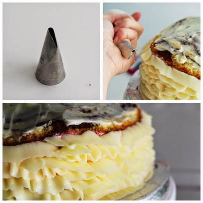 Después con la boquilla de pétalos en la posición que os enseño en la fotografía iremos colocando la crema por todo el lateral de la tarta girando el plato y haciendo pequeñísimos movimientos zig-zag ( de arriba a abajo) para hacer la forma.