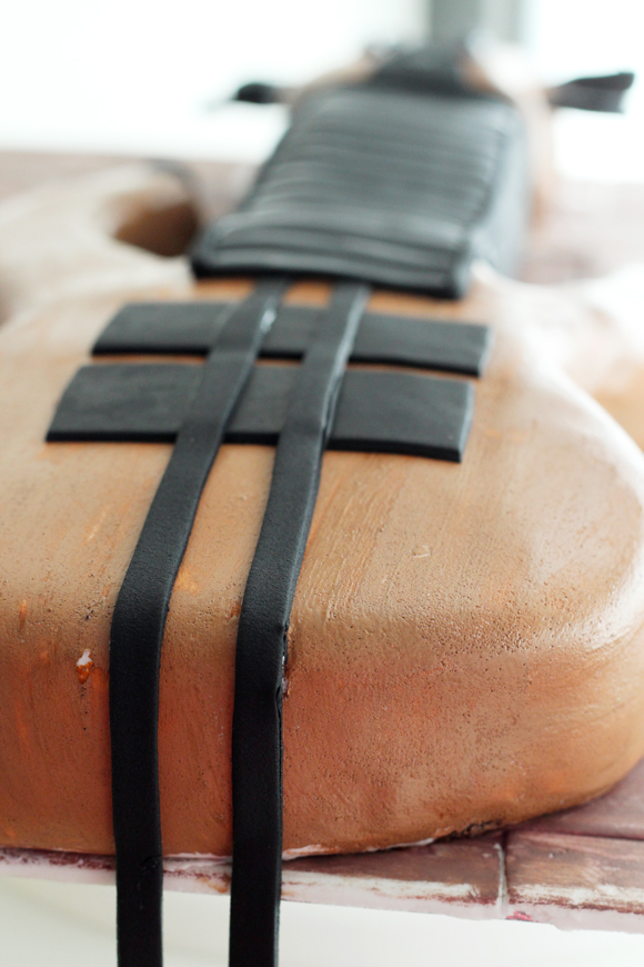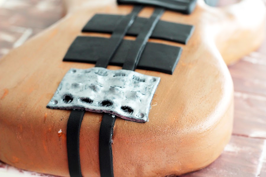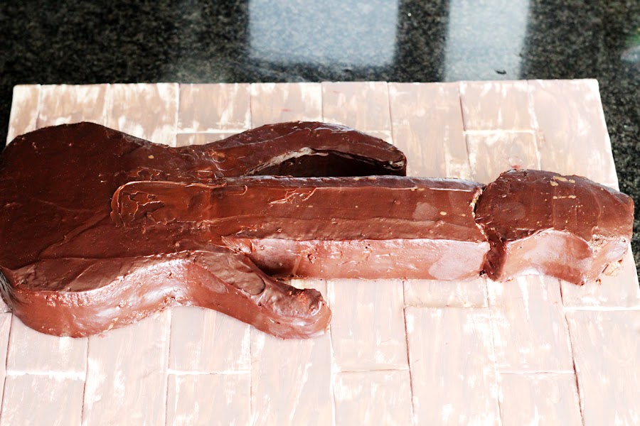 Recordar con la esteca cuchillo darle forma al fondant en la base de la tarta para dar el efecto de guitarra, queda mejor que si queda recto.