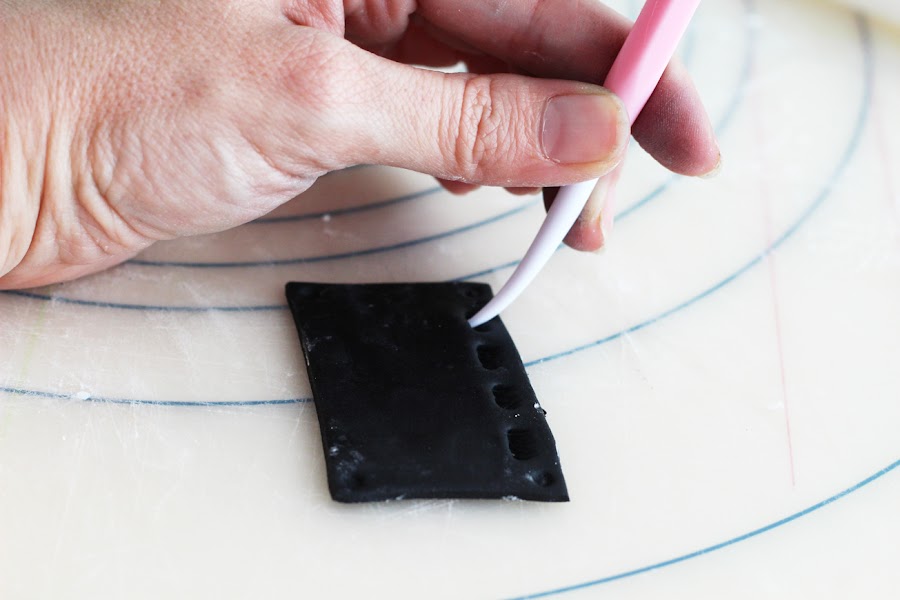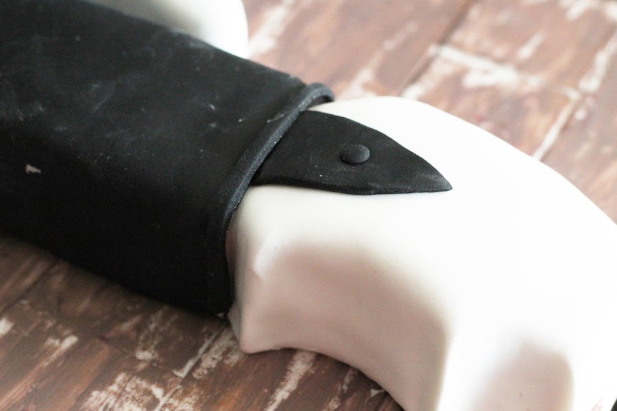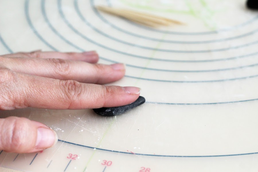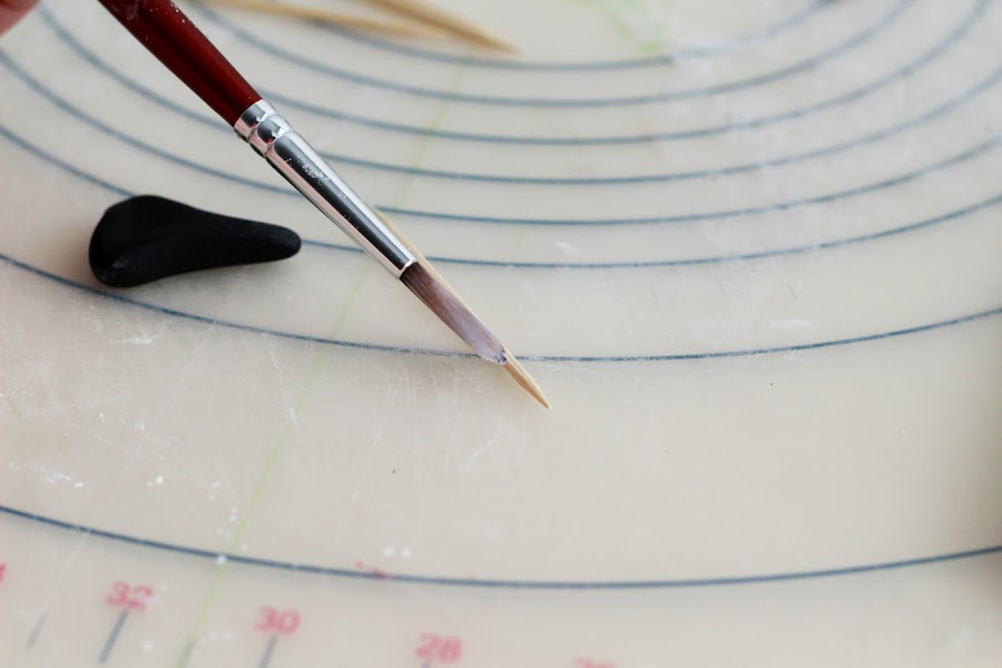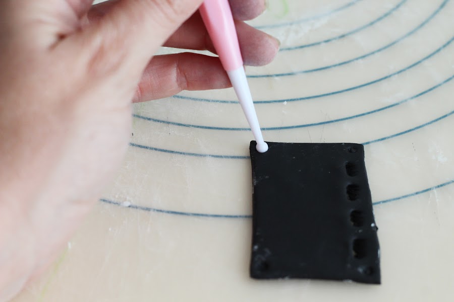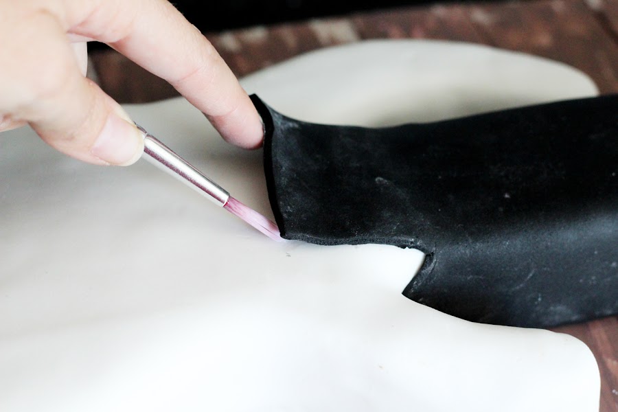 Le daremos la forma deseada para que se adapte el diseño. I con un poco de agua y un pincel pegaremos el fondant negro que queda encima del blanco.