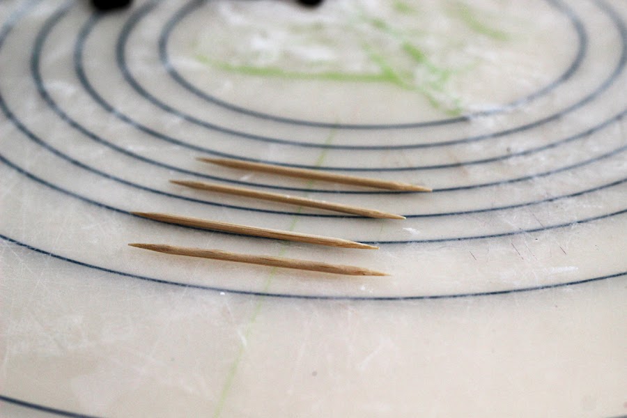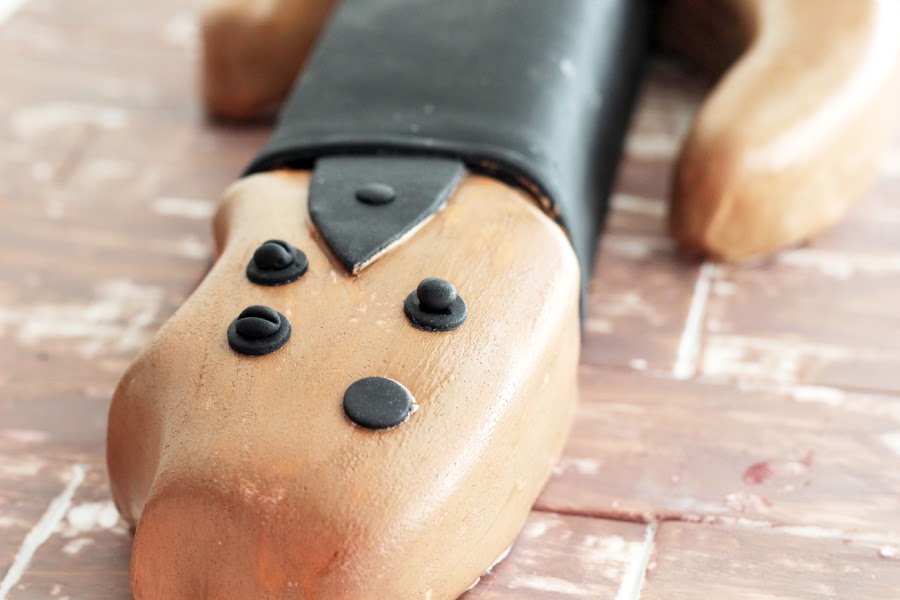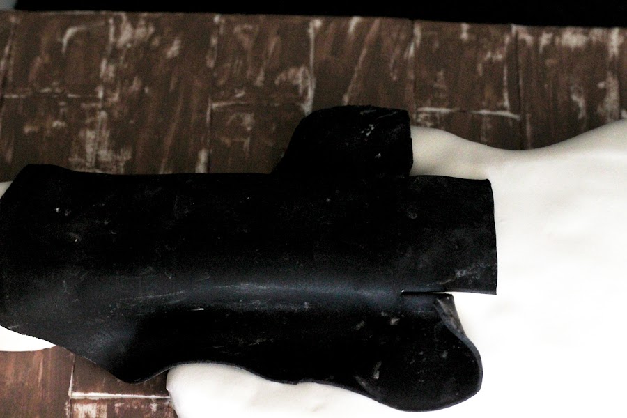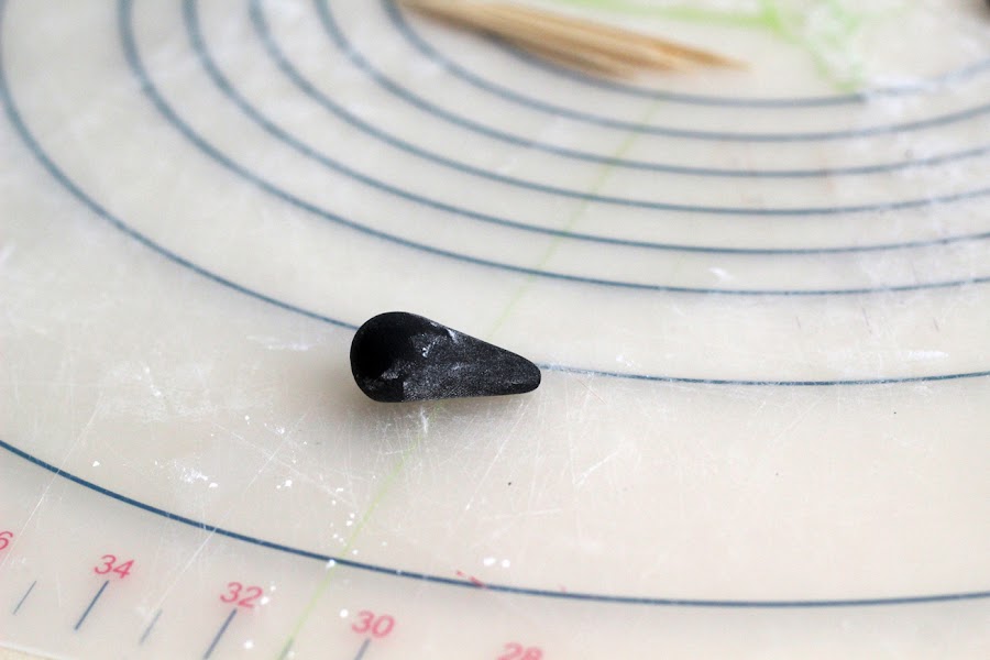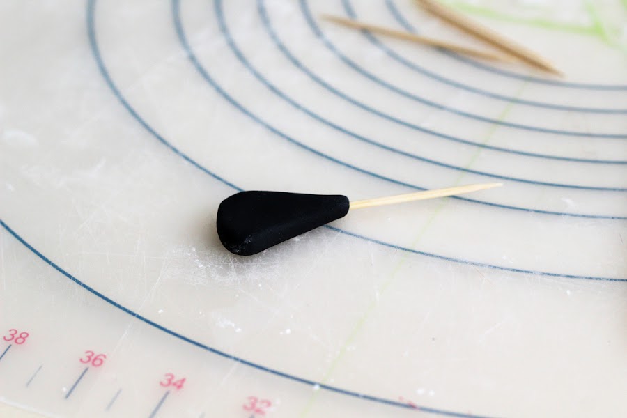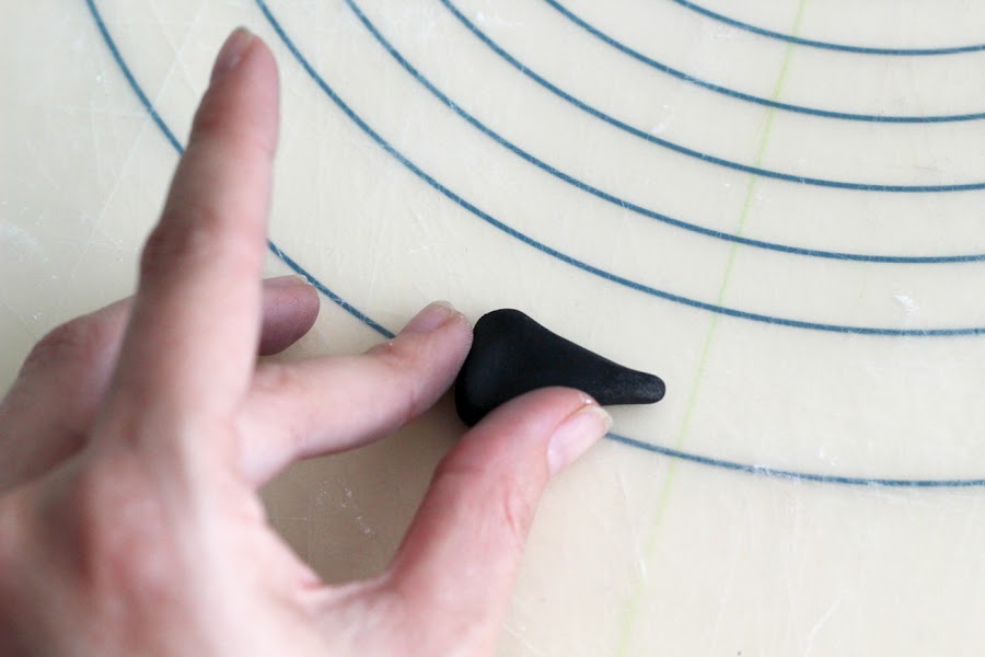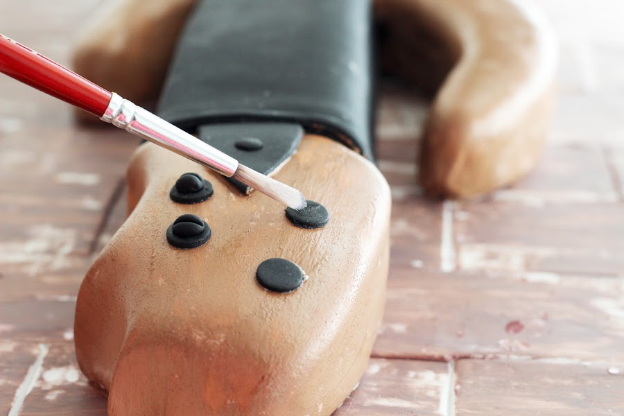 Le daremos la forma deseada para que se adapte el diseño. I con un poco de agua y un pincel pegaremos el fondant negro que queda encima del blanco.