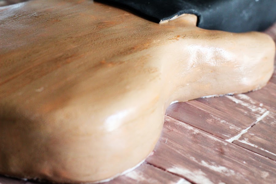 Una vez el diseño base esta ya colocado pintaremos de marrón clarito todo el fondant blanco para darle en color guitarra. Lo haremos con un pincel medio, a pinceladas y siempre hacia la misma dirección para darle el efecto deseado.