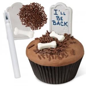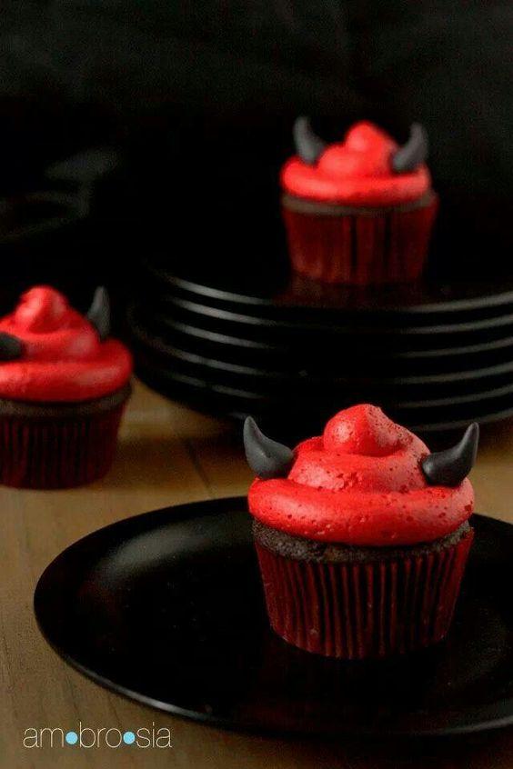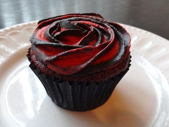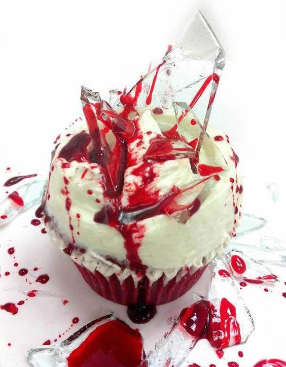Con unos cupcakes red velvet, usar el descorazonador de manzanas para sacar el centro del cupcake, rellenar con la crema de tu elección (cheese cream, buttercream, chantilly, merengue, etc) y poner mermelada o salsa de mora o fresa, poner la “tapita” de cupcake que sacaste con el descorazonador y procedes a decorar con la crema y la boquilla de tu elección para luego poner un poco de salsa de mora o fresa sobre la cobertura de crema y asemejar sangre