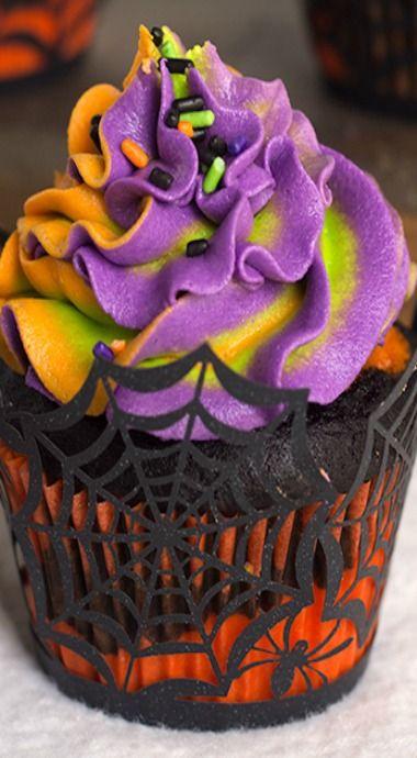 Usa un capacillo para cupcake de puntos para lograr una decoración de “sombrero de bruja” sobre una cama de crema y lograr tus cupcakes motivo halloween: