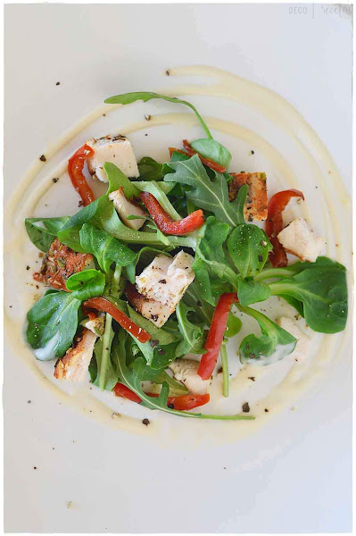En el fondo del plato pon la salsa de yogur con ayuda de un biberón en círculos. En el centro de los círculos, pon unas hojas de rúcula y de canónigos, el pollo a la plancha ( el mío, adobado y cocinado en a freidora sin aceite) y los pimientos rojos asados.