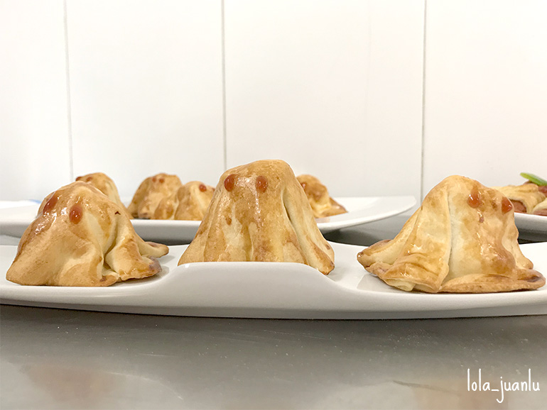 Mientras, preparamos el relleno, para ello, cortamos el jamón de york en brunoise, si es necesario, y lo introducimos en un bol. Añadimos el queso crema y mezclamos bien. Lo reservamos en la nevera para que, a la hora de rellenar el interior de los fantasmas, la mezcla de jamón y queso esté lo suficientemente fría para que no caiga del interior de los fantasmas.