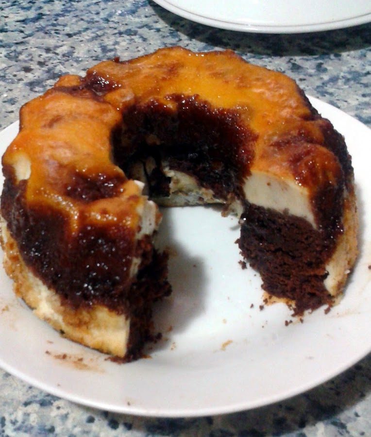 Se mezclan los ingredientes del bizcocho, luego se hace la del flan, se prepara un molde y se le vierte el caramelo, la mezcla del bizcocho y después se vierte la mezcla del flan poniendo delante una cuchara, echando con cuidado.