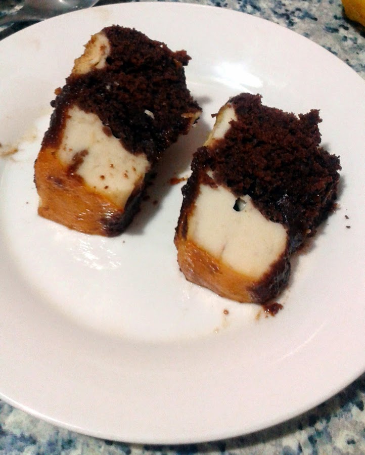 En la elaboración explicaban que aunque echas la masa del bizcocho y después la del flan al cocerse se invierten, y así ha sucedido.