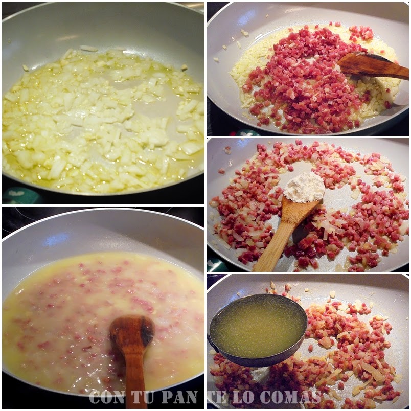 4. Cuando la cebolla transparente añadimos el jamón serrano muy picado y damos unas vueltas.