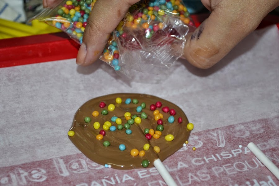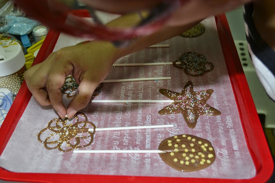 Luego como si no fuera suficiente con la tarta fui agregando cosas, mas retos... se me ocurrió hacer unas piruletas de chocolate, porque sí, porque las vi un dia en internet... soy una copiota...