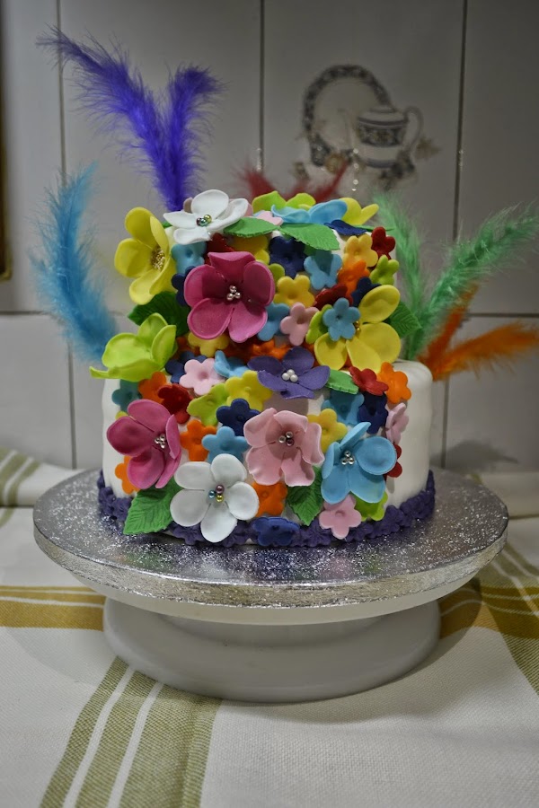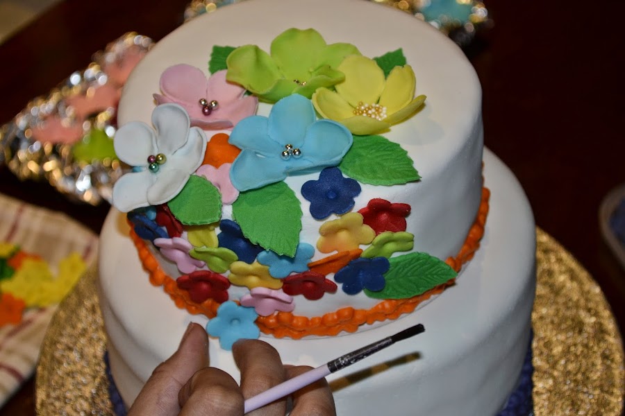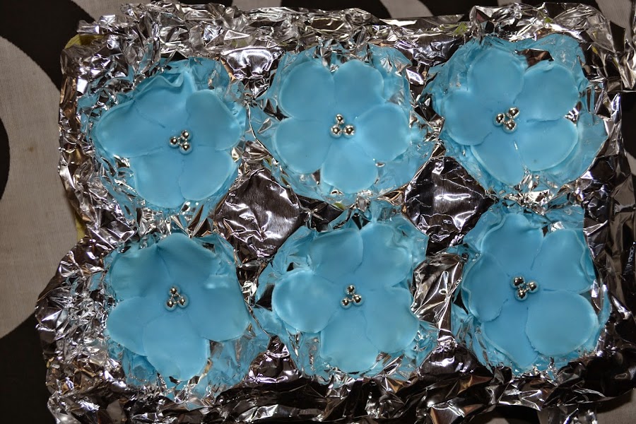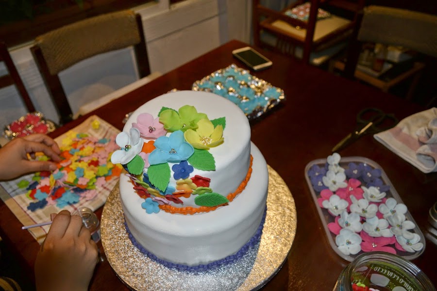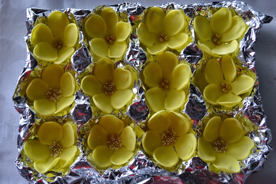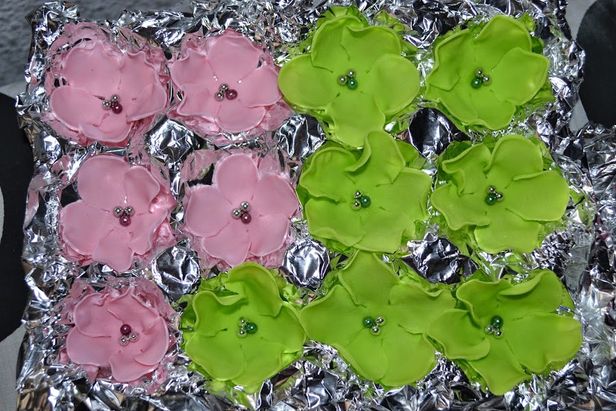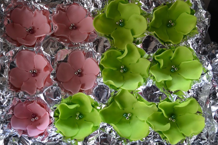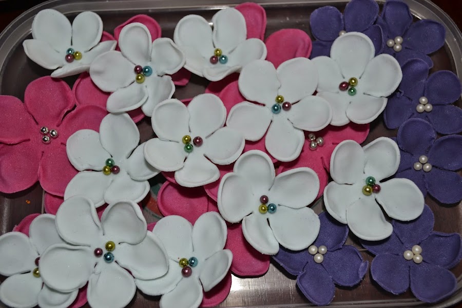 Unos dias antes del dia del cumple nos pusimos a hacer flores de fondant a lo loco, y digo nos pusimos porque mi pobre familia también ha participado. Hicimos flores de todos los colores y tamaños, Es necesario hacerlas unos dias antes para dejarlas secar y poder manipularlas.