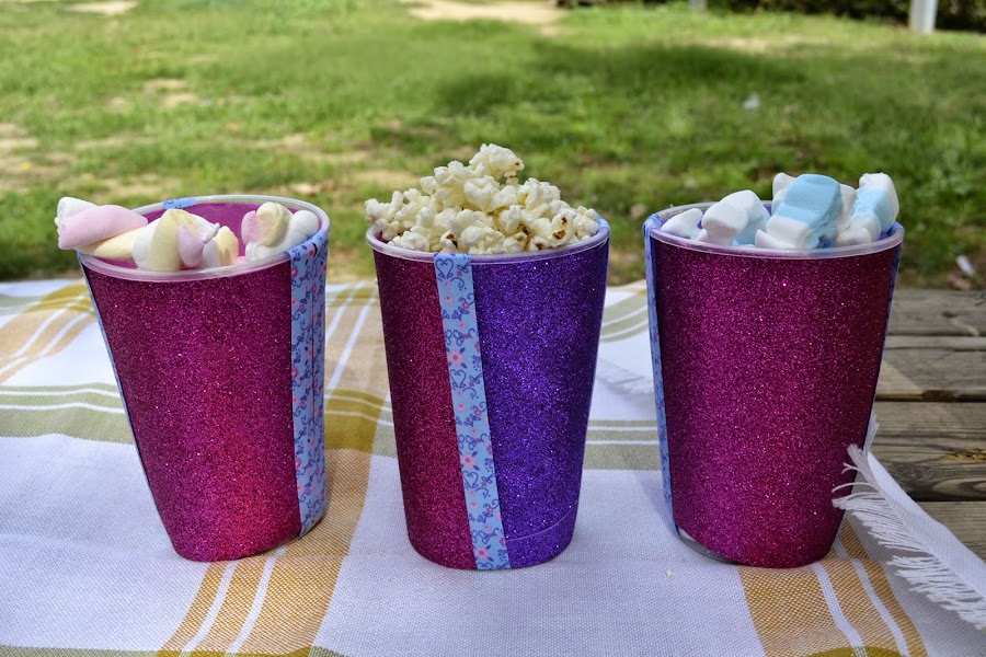 Ahhh, también forré unos vasos gigantes con una cartulina que lleva brillitos, para poner dulces, palomitas y esas cosas...
