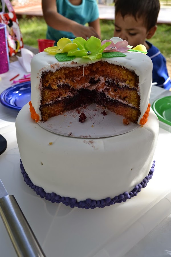 Y como no podía faltar, el corte de la tarta para que la veas por dentro, estaba rellena de mermelada casera de frutos rojos, crema de mantequilla de frambuesas y te juro que estaba muy muy rica.