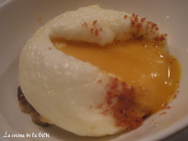 Es una esfera de salmorejo que la consiguen haciendo dos medias esferas y congelandolas, las unen, y las bañan en manteca, por lo cual el interior vulve al estado liquido. Se presenta con unas migas de iberico debajo, Te lo metes entero en la boca, y cuando lo muerdes, de repente es una eclosión de textura y sabores increibles. Genial!!!