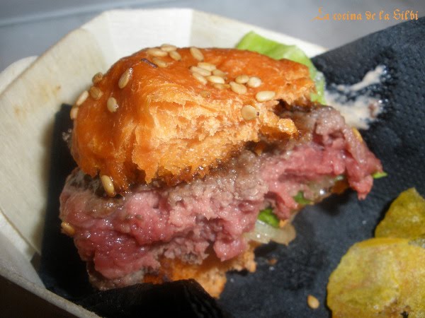 Una mini hamburguesa de kobe, al punto, jugosa y con sabor excepcional acompañada de unos chips de platano. No me dió tiempo hacerle la foto cuando estaba entera....jajaja