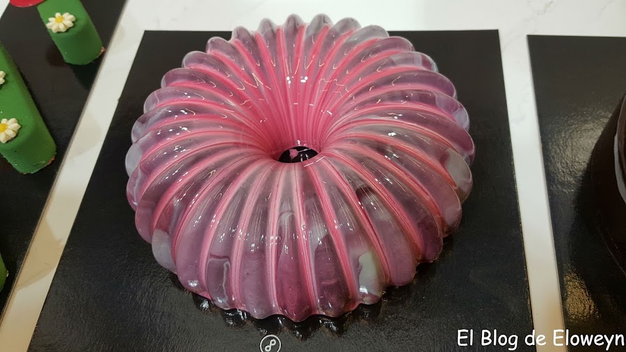 El tercero fue un glaseado espejo hecho con chocolate blanco y coloreado con dos colores: rojo y blanco. Tenía un efecto como de mármol. Precioso.