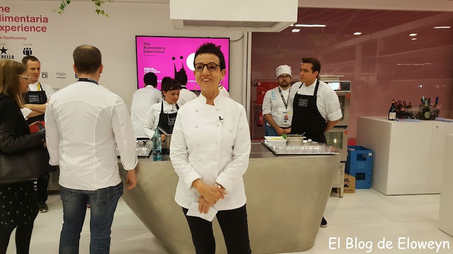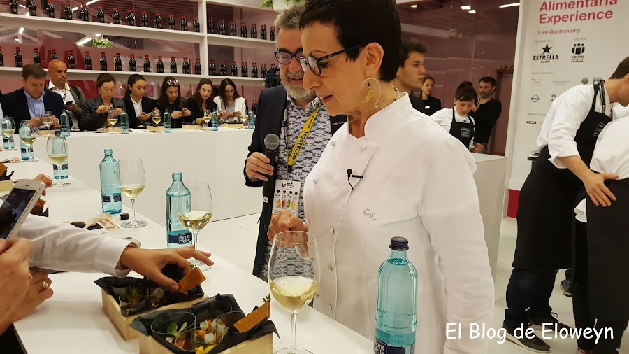 ¡Y llegó la hora del taller magistral de Carme Ruscalleda con su hijo Raúl Balam! Allí que me planté... la sala Alimentaria Experience estaba llena de prensa. Sigo a los dos por Instagram. Raúl es más activo que Carme, y me encanta su personalidad. Raúl y Carme llevan el restaurante Moments del hotel Mandarín Oriental, en Barcelona.