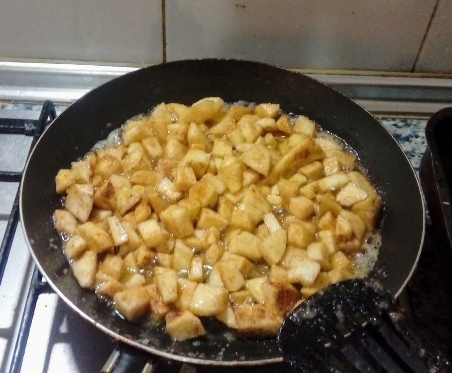 Le espolvoreamos la canela en polvo, preparamos una sartén con una cucharada de mantequilla dejamos derretir al fuego y veremos el azúcar, removemos y seguido echamos las manzanas, lo mezclamos bien y topamos con una tapadera a fuego lento durante 10 min.