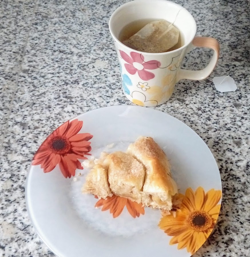 Era una espiral de pasta filo rellena de manzanas hecha por nuestra amiga MEGASILVITA, enseguida apunté la receta y la preparé para el desayuno.
