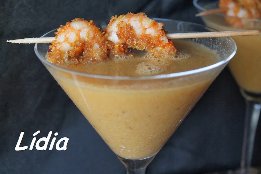 Serviremos la crema en unas copas y unas brochetas con los langostinos crujientes