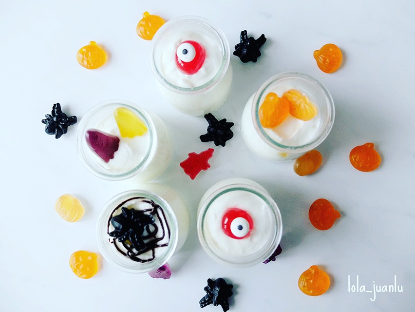 Mousse de yogur con corazón de manzana y topping de Halloween