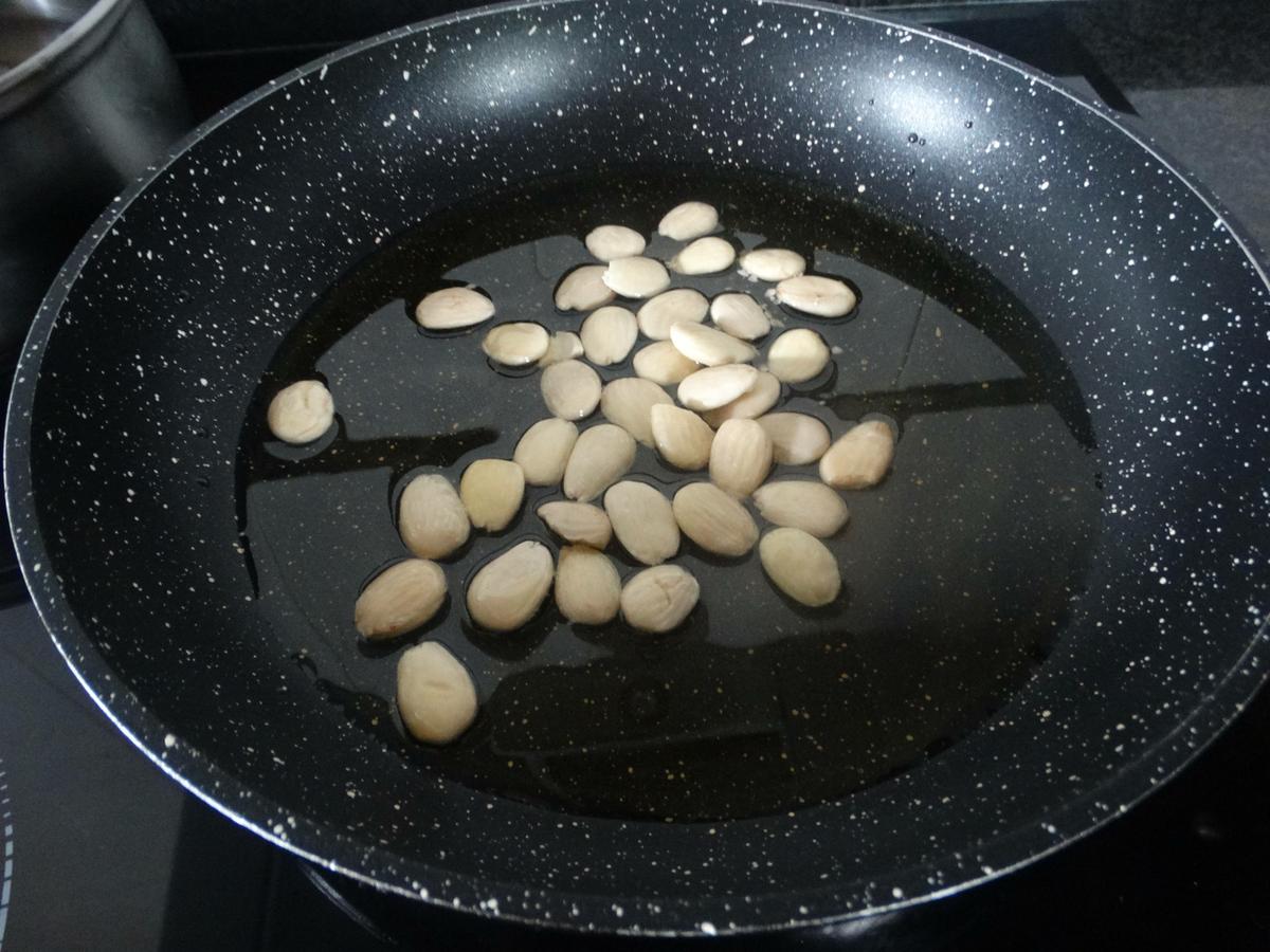 Empezaremos poniendo un buen aceite de oliva en la sartén y tostaremos en él las almendras. Las reservamos.