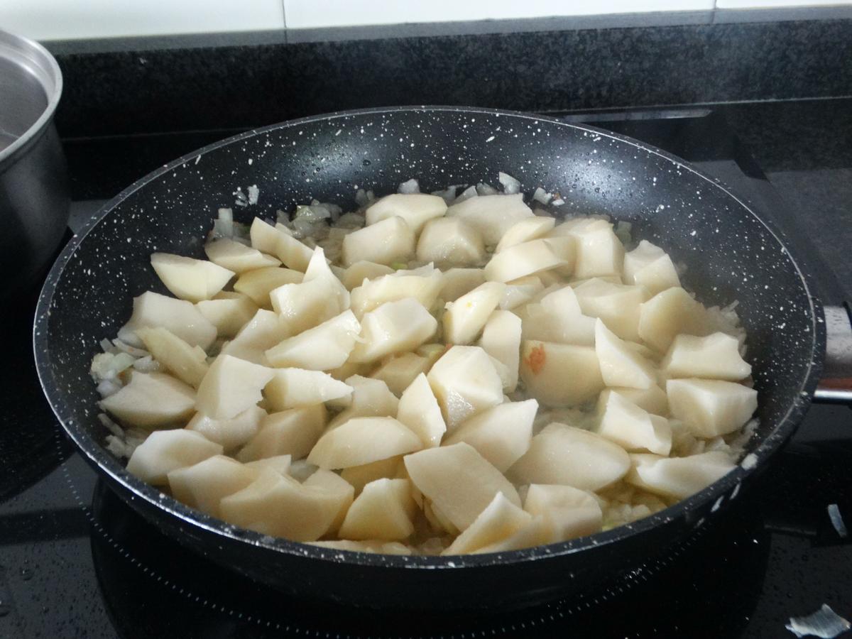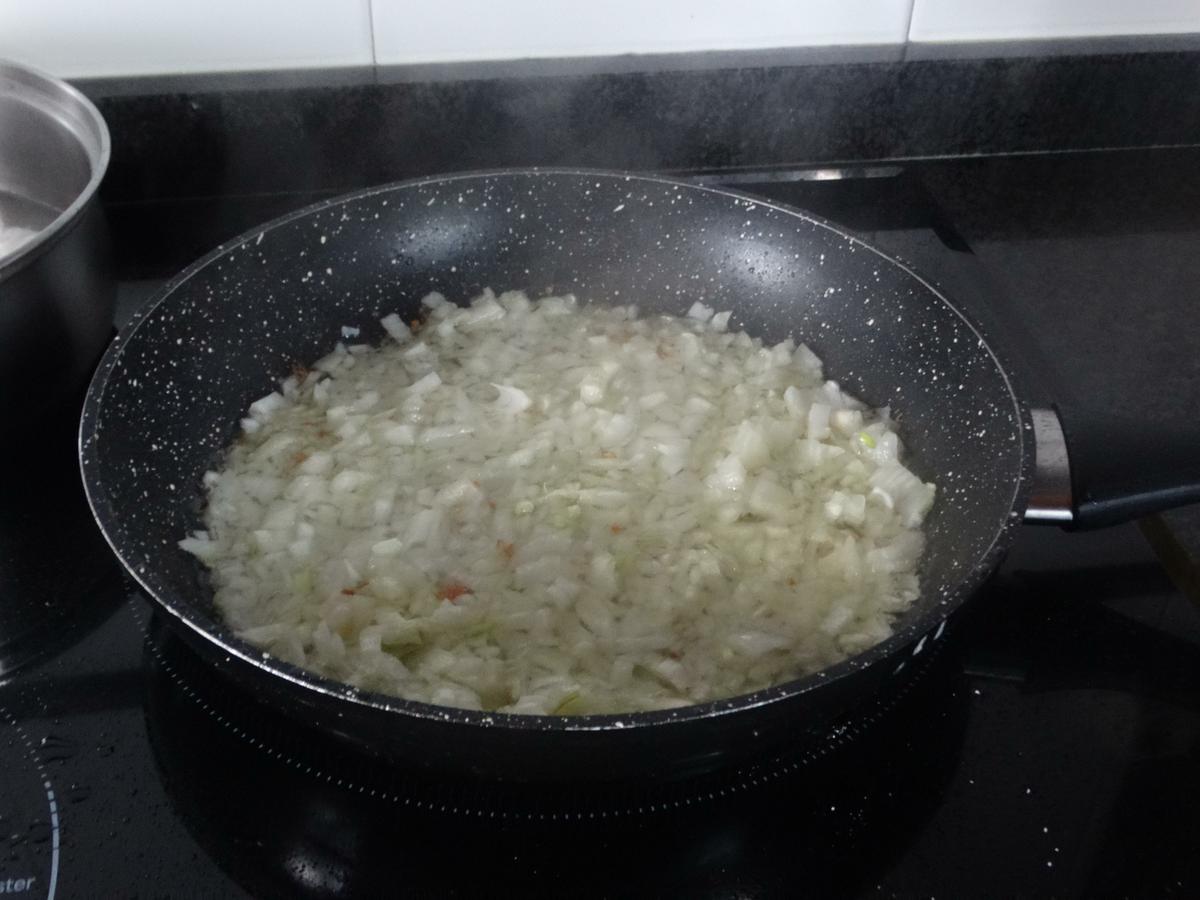 Bajamos el fuego y en el mismo aceite vamos a rehogar a continuación la cebolla picada en brunoise.