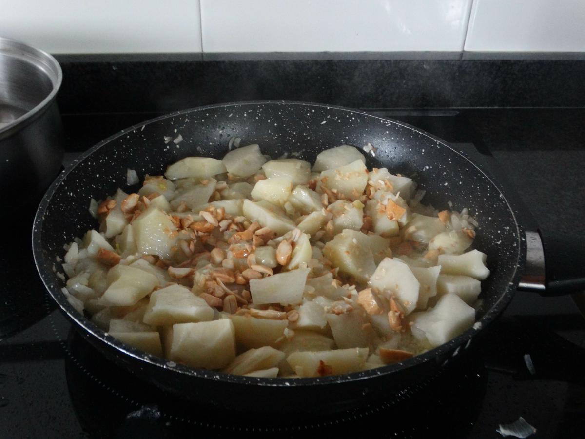 Cuando la cebolla esté pochada añadimos las patatas chascadas en trozos pequeños, les damos unas vueltas e incorporamos las almendras laminadas, los ajos picaditos y una cucharadita de pimentón. A continuación agregamos el tomate rallado.