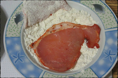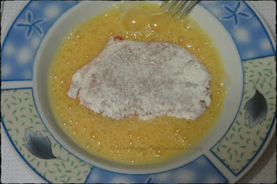 Empezar rebozando el lomo, pasar por harina y huevo y en una sarten con aceite abundante freirlo y reservarlo. Reservar el aceite para freir la cebolla después.