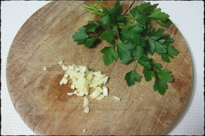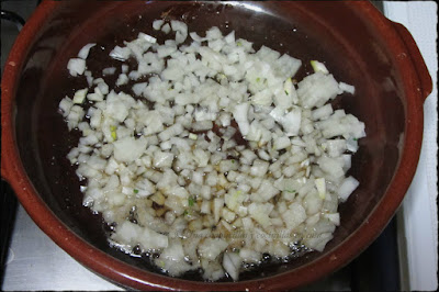 A continuación picar el diente de ajo, el perejil y la cebolla. En la cazuela, saltear en el aceite que habiamos reservado de cocinar el lomo.