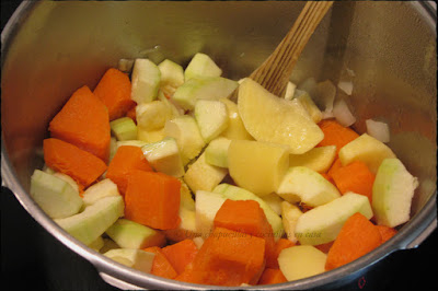 Empezamos pelando y quitando las pepitas de la calabaza y troceando todo, el calabacin (si lo deseais lo dejais con la piel bien lavado claro) tambien en trozos de similar tamaño, la cebolla, la patata, y los dientes de ajo en trocitos.