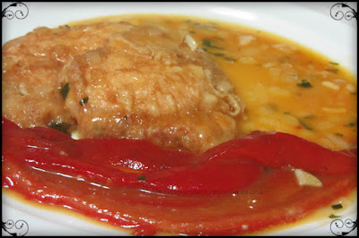 Vamos con el segundo plato, es un lomo adobado preparado un poco diferente, en cazuela de barro (en la cazuela a mi me sabe todo mas rico) con una salsita muy rica y acompañado de pimientos rojos asados caseros, ummm riquisimo.