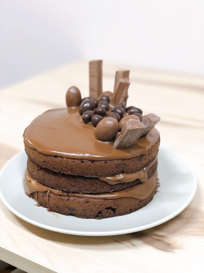 Extendemos la crema de cacao entre piso y piso de bizcocho y en su parte superior.