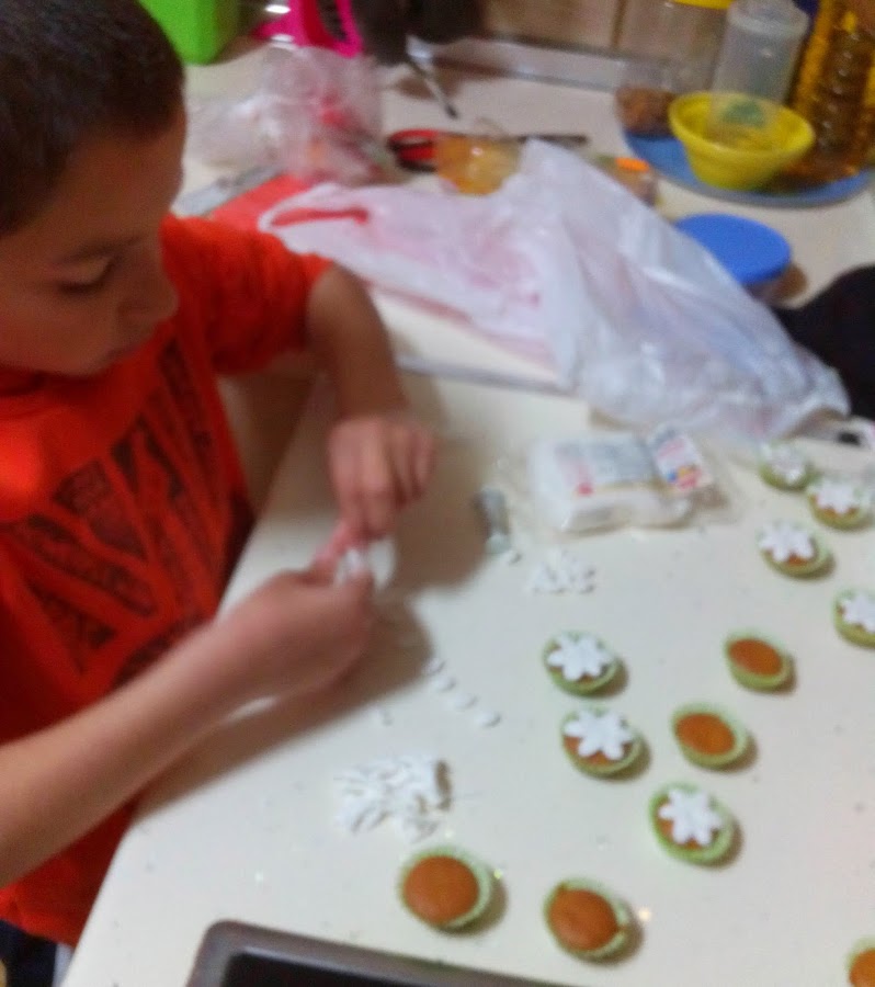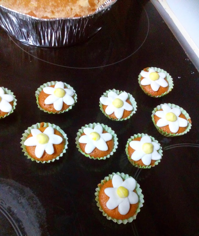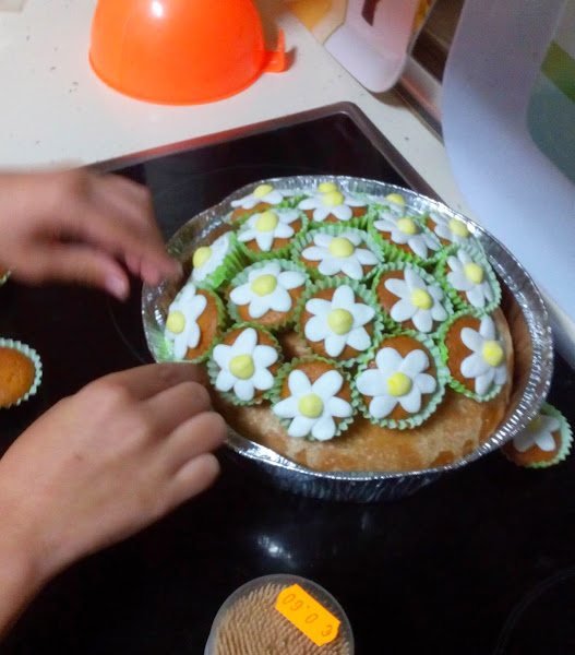 La verdad es que es un manitas mi hijo para las manualidades, tiene mas paciencia que yo. Fue pegando una a una todas las flores a los cupcake.